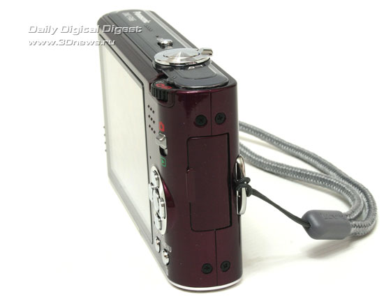 Левая сторона камеры пустует, а справа установлено металлическое ушко крепежного шнурка и дверца, скрывающая разъем micro-USB, предназначенный для подключения USB и аудио/видеокабеля, а также порт mini-HDMI (тип C).