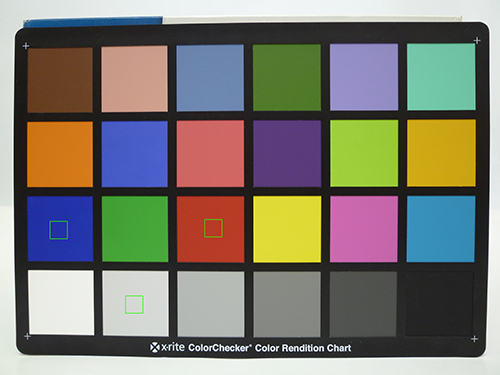 Также с чувствительностью от 80 до 1600 единиц была сфотографирована тестовая таблица Munsell ColorChecker. На снимке, приведенном ниже, зелеными квадратами обозначены области кроп-фрагментов.