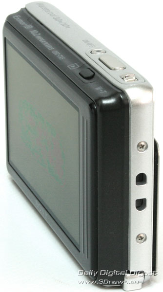 Сверху расположены клавиши питания, спуска затвора, перехода в режим просмотра, а также крохотный и не очень удобный рычажок управления трансфокацией.