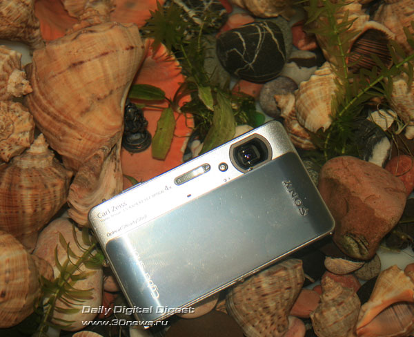 Как и во всех остальных современных фотоаппаратах Sony Cyber-shot, в тестируемом фотоаппарате предусмотрена функция звукового фона при просмотре фотографий в режиме слайд-шоу. По умолчанию установлены четыре инструментальные мелодии, которые можно изменять при помощи ПО из комплекта поставки. Программа загрузки мелодий поддерживает форматы CD-DA и mp3, длительность мелодии ограничена 180 секундами. Также интересна функция управления просмотром отснятого материала на ТВ при помощи пульта всё того же ТВ, разумеется, телевизор должен быть Sony Bravia. К сожалению, последнюю особенность проверить не удалось. Но главная "фишка" камеры - это всё же сенсорный дисплей и пыле/влаго/виброустойчивый корпус. К сожалению, камера выдерживает погружение лишь на глубину до трех метров, чего достаточно разве что при подводной фотоохоте без акваланга. К слову, при работе с камерой в воде сенсорный ввод работает так же быстро и безошибочно даже в перчатках. Также стоит отметить удачную конструкцию защитной панели, которая хорошо удаляет капли воды, поэтому пользоваться камерой вне воды можно практически сразу же после водных процедур, тогда как у абсолютно всех водонепроницаемых камер, которые успели побывать у нас на тестировании, с этим проблемы – либо защитных шторок нет вовсе и объектив собирает «пальчики», либо шторки есть, но расположены таким образом, что капли надолго остаются на объективе и его приходится просушивать. Единственная камера, которая не так страдала от этих недостатков, была схожая по дизайну с героем материала Olympus [mju:] 1050 SW, но в данной камере щель между защитной сдвижной панелью и корпусов довольно велика, поэтому в неё может попадать песок, тогда как у тестируемой камеры нет и этого недостатка. В общем, для туриста, разумеется, если турист не экстремал, которому нужна максимальная защита и большая глубина погружения, эта камера – находка.