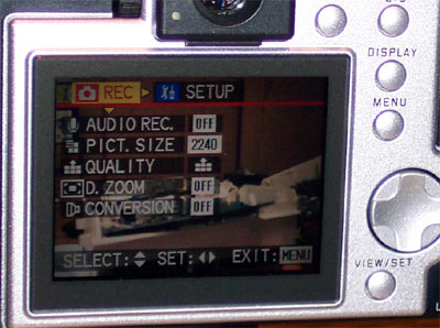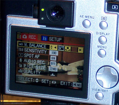 Его размер целых 2.5 дюйма, что своеобразный (а может и не своеобразный) рекорд для цифровых фотокамер. По крайней мере, я про экраны большего размера на фотоаппаратах не слышал. Как уже говорилось, при работе на LCD высвечивается полная информация о параметрах, с которыми будет сделан снимок: диафрагма, выдержка. Если, с точки зрения автоматики камеры с текущими настройками, не получится хороший снимок, то "неправильное" значение будет выделено красным цветом. Эта же информация записывается и на карту памяти вместе с снимком. Поэтому, впоследствии при просмотре фотографий не приходится гадать почему тот или иной снимок получился на так, как задумывалось.