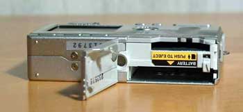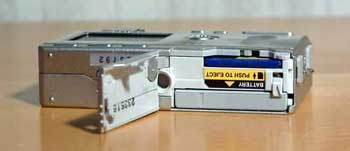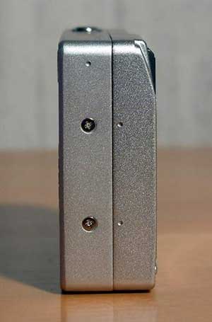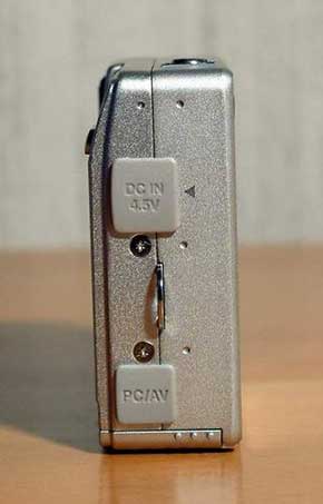 Как все эти возможности уместились в сверхкомпактном размере корпуса фотокамеры (83х52х20 миллиметров) - уму непостижимо! Вот как она смотрится рядом со спичечным коробком. ![]() Для ношения в кармане рубашки этот размер идеален, а для фотосъемки - как минимум непривычен. Приходится держать фотоаппарат пальцами - ладони просто не во что упереться. Женский размерчик, одним словом. Хорошо, что корпус камеры выполнен из металла - и прочен, и выглядит красиво, и хоть какое-то (113 грамм с аккумулятором и картой памяти) ощущение веса создает. На передней панели корпуса ассиметрично встроен телескопический объектив, там же расположены оптический видоискатель (в правом верхнем углу снимка), вспышка, сенсор вспышки, светодиод таймера и фотодиод дистанционного управления. ![]() Справа на верхней части корпуса расположена кнопка включения (небольшая, круглая и несколько утопленная в корпус), а чуть левее - кнопка затвора (большая, продолговатая и выступающая над поверхностью корпуса) . ![]() Если вы нажмете на кнопку включения, то ее прозрачная пластиковая окантовка засветится красивым зеленым светом, при этом телескопический объектив выедет из корпуса и займет стартовое положение . ![]() Интересно, что в режиме диктофона ореол вокруг кнопки включения будет светиться красным цветом. Мелочь, а красиво!На задней панели фотоаппарата расположены: жидкокристаллический экран, окошко оптического видоискателя с двумя светодиодными индикаторами, правее - две кнопки управления режимами вспышки (автоматическая, постоянно включена, постоянно выключена, автоматическая с уменьшением эффекта "красных глаз" и постоянно включенная с уменьшением эффекта "красных глаз") и фокусировки, еще правее - удлиненная кнопка-качалка трансфокатора. В центре задней панели находится круглая мультирежимная кнопка-джойстик для навигации по меню и выполнения ряда других операций. Правда, "оперировать" этой кнопкой удобно только тонкими женскими пальчиками - я часто вызывал не ту функцию, которую хотел. Ниже этой кнопки видны отверстия, за которыми скрывается громкоговоритель. Под жидкокристаллическим экраном расположены три кнопки для управления меню, переключения режима экрана и включения воспроизведения (просмотра снимков или видео). ![]() На боковой поверхности корпуса камеры (правой, если считать со стороны фотографа) расположены два закрытых серыми резиновыми заглушками гнезда, между которыми расположена скоба для крепления шнура переноски фотоаппарата . ![]() Под верхней заглушкой с надписью "DC IN 4.5V"скрывается гнездо для подключения дополнительного сетевого адаптера (в комплект не входит!). ![]() Под нижней заглушкой с надписью "PC/AV" спрятано гнездо для подключения фотокамеры к компьютеру или телевизору. ![]() На левой боковине корпуса ничего интересного нет . ![]() На нижней поверхности фотокамеры расположен отсек аккумулятора и карты памяти, а также стандартное резьбовое отверстие для крепления фотоаппарата к штативу (в центре). ![]() Отсек аккумулятора и карты памяти скрыт пластиковой крышкой, механизм крепления которой сначала не вызывал ощущения надежности. Но после нескольких циклов открывания - закрывания это неприятное ощущение исчезло. ![]() Аккумуляторная батарея крепится в отсеке при помощи небольшой пластиковой защелки, а карта памяти просто вставляется до щелчка. Ч