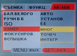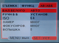 Меню камеры Premier DS-8650 отличается невыразительным оформлением и аскетичностью. Если первое – дело вкуса, то второе качество для начинающих пользователей, скорее, в плюс, чем в минус. Все настройки, выводимые на экран в режиме съемки, разбиты на три основные вкладки: съемка, функц. и АВ/АББ. Впрочем, все необходимые параметры поддаются изменению, правда, перевод, порой, не слишком удачен, чего только стоит пункт меню "Бип", который, как выяснилось, отвечает за подачу звукового сигнала при успешной фокусировке. Так выглядит экран камеры при съемке: