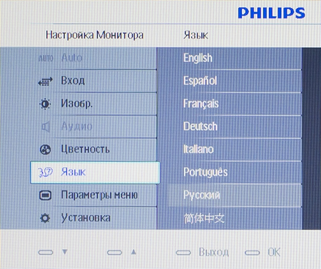 Экранное меню переведено на русский язык, но перевод плохой. Назначение некоторых опций трудно понять по названию, другие названия, наоборот, хорошо понятны благодаря тому, что остались на английском. Текст набран неряшливо: часть надписей начинается с заглавной буквы, часть — со строчной.