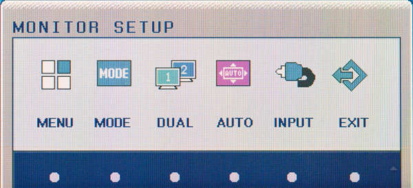 Меню монитора аналогично интерфейсу старшей модели и, соответственно, столь же небогато настройками. Нажатие любой кнопки вызывает быстрое меню, которое позволяет изменить видеовход, автоматически выровнять геометрию и положение изображения, поступающего по аналоговому интерфейсу, выбрать один из предустановленных режимов изображения, активировать функции фирменной утилиты Dual Mode, а также войти в расширенное меню для более тонкой настройки монитора.