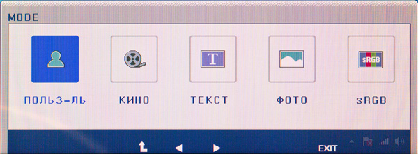 | Режим | Кино | Текст | Фото | sRGB | Пользовательский (теплый) | Пользовательский (средний) | Пользовательский (прохладный) | Пользовательский (50/50/50) |