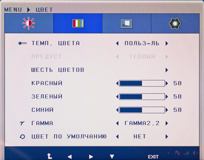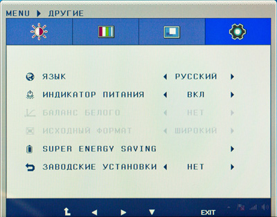 Тонкая настройка предусматривает использование не только базовых компонентов цветовой модели RGB, но и промежуточных цветов, а именно: голубого, пурпурного и желтого. Причем для каждой оси можно задать как уровень насыщенности, так и оттенок. Кроме того, пользователю доступен показатель гамма-кривой, который варьируется в пределах от 1,8 до 2,6. К сожалению, тонкой настройки цветовой температуры не предусмотрено (только путем регулировки соотношения базовых компонентов RGB), однако можно выбрать один из пресетов: «теплый», «средний» или «прохладный». Прочие страницы позволяют настроить отображение аналогового сигнала, а также задать другие параметры самого монитора, такие как, например, энергосбережение. В целом меню удобное, содержательное и интуитивно понятное. Стоит отметить, что ситуация с локализацией не изменилась: приветственное окно по-прежнему на английском, остальные страницы полностью переведены на русский язык, причем качество перевода не вызывает нареканий.