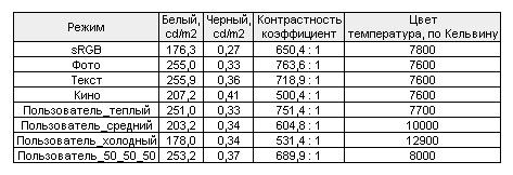 Анализ результатов измерения основных параметров изображения в предустановленных и пользовательских режимах показал, что выбор пресетов «sRGB» и «Кино», а также пользовательского режима с опциями цветовой температуры «средний» и «прохладный», значительно понижает уровень яркости по сравнению с естественным режимом работы матрицы. При этом контрастность имеет небольшой разброс относительно значения 700:1, и только предустановка «Кино» сильно проседает по этому показателю. Кроме того, цветовая температура во всех режимах далека от 6500 К, однако наиболее близкий к этому значению результат демонстрируют предустановки «Фото», «Текст» и «Кино». Стоит отметить, что пользовательский режим с опциями цветовой температуры «средний» и «прохладный» увеличивает ее до запредельных значений.