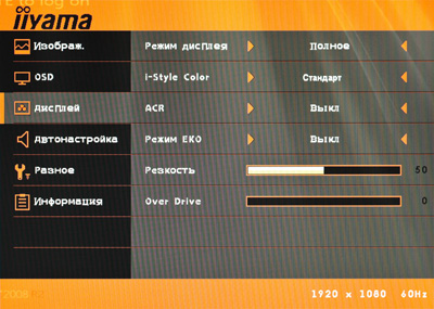 Все предустановленные режимы в пункте «Дисплей» имеют готовые сочетания яркости, контраста и цветовой температуры, а также преднастроенные резкость и овердрайв. Если самостоятельно изменить один из параметров, автоматически активируется режим «Стандарт», что позволяет считать его ручной настройкой. Выбор этой предустановки, кроме того, открывает доступ к более тонким регулировкам цветовой температуры на основе базовых компонентов цветовой модели RGB. Также в этом пункте меню можно активировать режим ACR, усиливающий контрастность изображения, выбрать соотношение сторон сигнала и включить режим экономии EKO.