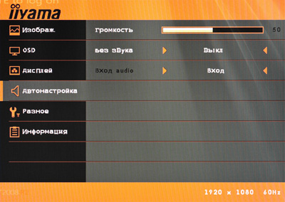 В пункте «Автонастройка» можно отрегулировать громкость звука (это проще сделать двумя отдельными кнопками на самой панели), а также выбрать режим «Без звука». Кстати, монитор имеет интересную особенность: аудиопорт можно использовать и как вход, например подключить выход звуковой карты к встроенной акустике, и как выход, например подключить к дисплею домашний кинотеатр. Соответствующий режим работы можно выбрать в данном пункте меню.