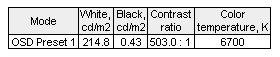 С помощью программы Spyder3Elite монитор был откалиброван в пользовательском режиме предустановкой цветовой температуры 6500 К. В ходе проведения замеров выяснилось, что измеренное значение практически точно соответствует заявленному. А поскольку целью калибровки было достижение цветовой температуры 6500 К и гаммы 2,2 с сохранением максимальной яркости, то было решено воспользоваться именно готовой предустановкой.
