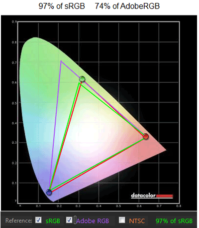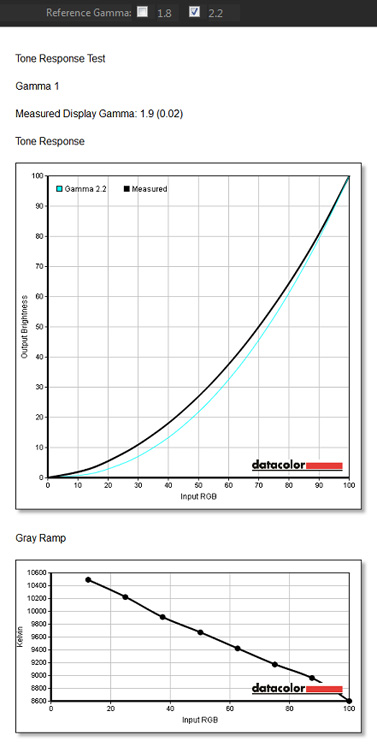 С помощью программы Spyder4Elite дисплей был откалиброван для достижения максимально точной цветопередачи и максимально широкого цветового охвата. Для этого был выбран пользовательский режим «Стандарт» с предустановкой цветовой температуры, соответствующей естественному режиму работы матрицы, а именно с поканальной настройкой базовых цветов, установленной на 100% для каждого цвета. Кроме того, был выбран показатель гамма-кривой, максимально соответствующий референсному значению. Итак, чего же удалось достичь в результате калибровки и какие параметры при этом снизились?