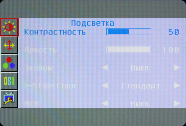 Меню состоит из пяти пунктов, и с его помощью можно управлять всеми функциями дисплея, а также полностью настраивать монитор. Все параметры сгруппированы по общим признакам, поэтому в целом меню удобно и интуитивно понятно. Кнопка MENU на передней панели осуществляет вызов основного окна. В пункте «Подсветка» можно настроить яркость и контрастность картинки, активировать экономичный режим, выбрать одну из предустановок изображения, а также включить режим повышенного контраста.