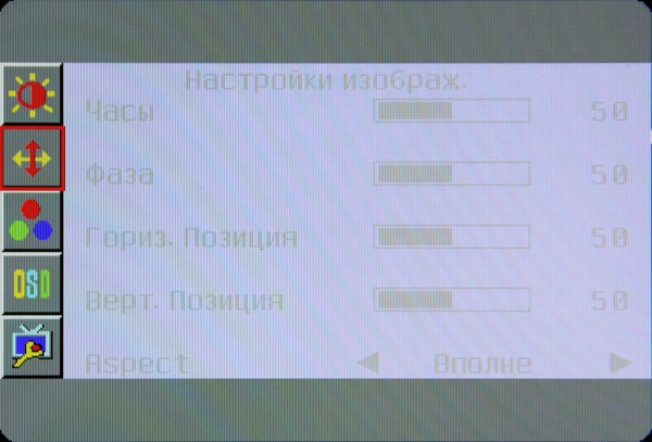 Следующее подменю «Настройки изображения» полностью посвящено регулировкам аналогового сигнала. Здесь можно настроить такие параметры, как синхроимпульс и фазу, а также выровнять изображение по горизонтали и вертикали.