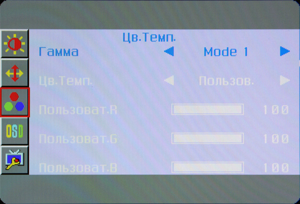 Все предустановленные режимы представляют собой готовые сочетания яркости, контраста, показателя гамма-кривой, а также цветовой температуры. Изменение какого-либо из параметров при любом активированном пресете приводит к автоматическому сбросу на установку «Стандарт», что позволяет считать ее пользовательским режимом. Здесь можно задать одно из значений цветовой температуры или настроить ее путем поканальной регулировки базовых цветов, а также выбрать показатель гамма-кривой.
