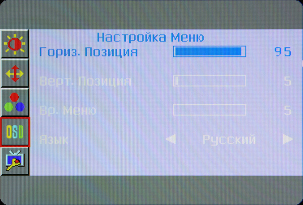 Локализация меню в целом хорошая, но есть явные недоработки в виде неточностей или непереведенных названий. Например, в подменю «Настройки изображения» термин clock, обозначающий тактовый или синхросигнал (в зависимости от контекста), незамысловато переведен как «часы», а совершенно явный термин aspect («соотношение») не переведен вообще.