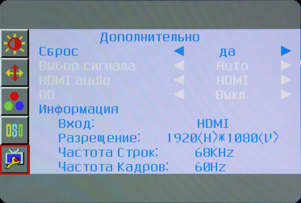 В пункте «Дополнительно» можно узнать, по какому входу поступает сигнал, частоту развертки и разрешение картинки, а также произвести сброс всех параметров до значений по умолчанию.