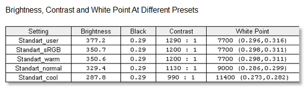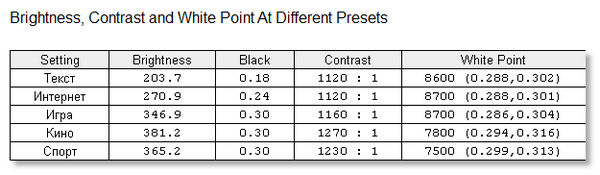 Исследование монитора производилось в пяти предустановленных режимах: «Текст», «Интернет», «Игра», «Кино» и «Спорт», а также в ручном режиме «Стандарт» с максимальной яркостью, контрастностью по умолчанию, различными пресетами оттенков белого и поканальной настройкой цветовой температуры, соответствующей естественному режиму работы матрицы без цветокоррекции. Кстати, поскольку монитор предусматривает несколько вариантов показателя гамма-кривой, предварительно было произведено исследование всех этих значений и выбран наиболее близкий к эталонному результат. Все дальнейшие измерения проводились уже в этом режиме. Именно его и решено было использовать для тестирования монитора на ширину диапазона яркости и контраста. В ходе измерения монитор продемонстрировал очень впечатляющие результаты по яркости: максимум измеренных значений составил 378,8 кд/м2! Это более чем на 26% превышает заявленное значение. Яркость черного растет нелинейно с 0,01 до 0,29 кд/м2, поэтому контрастность довольно высока до уровня посветки в 25% и составляет в среднем 6540:1. Затем происходит ее резкое падение до 1280:1 в оставшемся диапазоне. При том что заявленное значение составляет 3000:1, часть графика контрастности лежит гораздо выше этого уровня, а часть — значительно ниже (и все равно, даже минимальная контрастность гораздо больше, чем у любого монитора, который нам довелось тестировать за последний год. — прим. ред.).