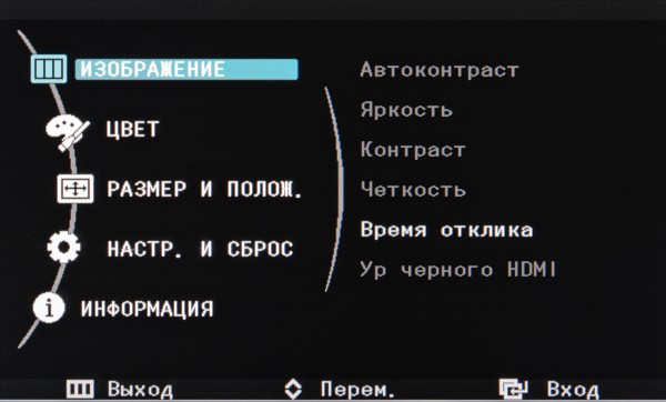 Меню сохранило общую структуру, однако наполнение пунктов изменилось. Оно по-прежнему полностью управляет всеми функциями монитора и, несмотря на множество подпунктов, удобно организовано и понятно без чтения инструкций. Вызов основного меню осуществляется путем легкого прикосновения к соответствующей сенсорной области. Пункт «Изображение» позволяет настроить яркость, контрастность, четкость и время отклика, а также активировать режим автоматического контраста в зависимости от условий внешнего освещения