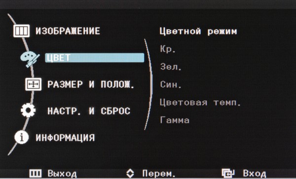 Настройки цветовой температуры и гамма-кривой объединены в отдельное подменю «Цвет», которое позволяет задать точку белого путем поканальной регулировки базовых цветов или выбрать одну из готовых предустановок, а также настроить показатель гамма-кривой. Стоит отметить, что пользователю доступен широчайший выбор значений цветовой температуры в пределах от 4000 до 10000 К с шагом в 500 К, а также огромный диапазон показателей гамма-кривой в пределах от 1,6 до 2,7 с шагом 0,1.