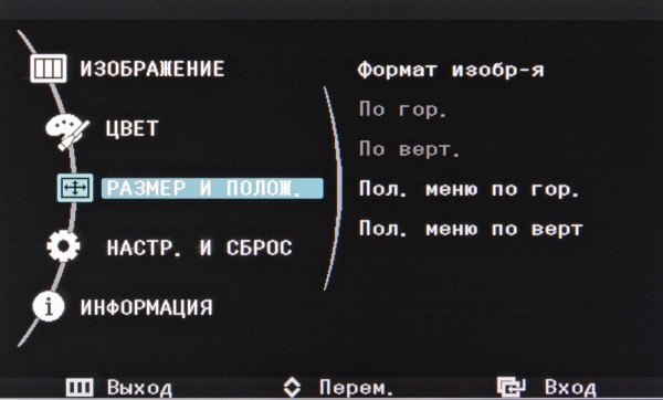 Подменю «Размер и положение», как следует из названия, позволяет выбирать формат изображения, а также положение окна меню на экране. Кстати, в старшей модели решили отказаться от функции отображения информации сразу из двух источников.