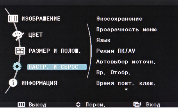 Пункт «Настройка и сброс» отвечает за настройку сервисных функций монитора, таких как автовыбор источника сигнала, язык интерфейса и даже время реакции на скорость нажатия. Кроме того, здесь можно произвести тонкую настройку интерфейса меню и осуществить сброс всех предустановок до заводских параметров. Стоит отметить, что режим экосохранения также находится в этом пункте.
