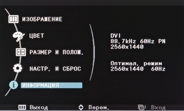 В подменю «Информация» можно узнать параметры входного сигнала, такие как частота развертки и разрешение, а также выяснить, какой видеовход активен в настоящее время.