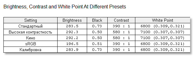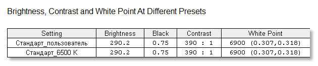 Кроме того, отдельно были изучены различные показатели гамма-кривой, а также был выбран наиболее близкий к эталонному результат, и все дальнейшие измерения мы проводили уже в этом режиме. Кстати, именно его и решено было использовать для тестирования монитора на ширину диапазона яркости и контраста. В ходе измерения монитор продемонстрировал хорошие результаты по яркости: максимум измеренных значений составил 290,4 кд/м2., что практически точно соответствует заявленному значению, однако по абсолютной величине это, конечно, не так уж и много. Яркость черного растет линейно с 0,22 до 0,75 кд/м2, поэтому контрастность, с учетом линейности белого, весьма стабильна и составляет в среднем 360:1 с небольшим разбросом. Это невысокий результат. Стоит отметить, что даже визуально яркость черного заметно высока.