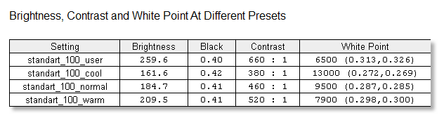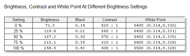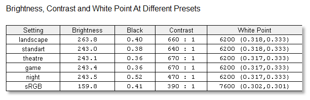 ⇡#Результаты тестированияИзучение монитора началось с исследования шести предустановленных режимов, а именно «Пейзажный», «Стандартный», «Театральный», «Игровой», «Ночной» и sRGB. Тестирование затронуло все основные параметры: гамма-кривую, постоянство цветовой температуры, широту цветового охвата и точность воспроизведения отдельных оттенков. Кроме того, мы отдельно исследовали предустановку «Стандартный» со 100% яркостью, контрастностью по умолчанию и различными пресетами цветовой температуры, среди которых есть и ручная регулировка яркости базовых цветов, после чего выбрали сочетание параметров, наиболее подходящее для калибровки и изучения монитора на однородность подсветки по полю экрана. Кстати, именно его и решено было использовать для тестирования монитора на ширину диапазона яркости и контраста. Итак, в процессе измерения монитор продемонстрировал неплохие результаты по яркости: максимум измеренных значений составил 258,5 кд/м2, что даже чуть больше заявленных 250 кд/м2, однако, учитывая, что пассивные поляризационные очки существенно уменьшают световой поток, монитору необходим более серьезный запас по яркости. Яркость черного также увеличивается вместе с ростом яркости белого, поэтому контрастность меняется в небольших пределах от 520:1 до 610:1. По абсолютному значению это весьма неплохой результат, однако, если оценивать относительно ориентировочного 1000:1, по этому параметру монитор не дотягивает до отличных оценок.  ASUS VG23AH — параметры изображения при различных уровнях яркости В результате измерений параметров различных режимов, установленных по умолчанию, выяснилось, что лидером стала предустановка «Пейзажный», которая продемонстрировала значение 263,8 кд/м2, что немного превышает паспортный параметр. Это хороший результат. Далее следует довольно большая группа пресетов с весьма близкими измеренными значениями. В нее вошли режимы «Стандартный», «Театральный», «Игровой» и «Ночной», при этом значения яркости лежат в пределах от 234 до 243,5 кд/м2. Эти результаты также находятся весьма близко к заявленному параметру, но, к сожалению, немного до него не дотягивают. И замыкает список предустановка sRGB, значение яркости которой составило всего 159,8 кд/м2. Это низкий показатель. Что касается контрастности, здесь места распределились иным образом. Лидерами категории стали пресеты «Театральный» и «Игровой» со значениями соотношения яркости белой и черной точек равным 670:1. В абсолютном значении весьма неплохо, но до 1000:1, которое мы приняли в качестве ориентира, конечно, не дотягивает. Чуть хуже выступил режим «Пейзажный», его показатель составил 660:1, это тоже хорошо. Немного отстала от него предустановка «Стандартный», значение контрастности 640:1 также находится на хорошем уровне. Сильно просев с результатом 470:1 на предпоследнем месте оказался пресет «Ночной». И замыкает список все тот же режим sRGB с показателем 390:1. К сожалению, это весьма низкий результат. Измерения цветовой температуры выявили абсолютное единодушие большинства предустановок. Пять из шести режимов продемонстрировали показатель цветовой температуры на уровне 6200 К, это довольно близко в эталонным 6500 К. И лишь пресет sRGB вновь выделился значительным расхождением с референсным значением. Его показатель составил 7600 К, что, конечно, является невыдающимся р