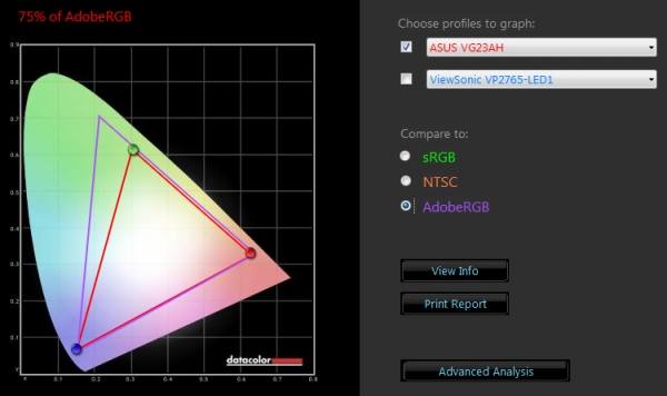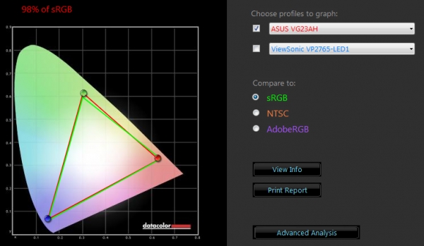 ASUS VG23AH, после калибровки — точность передачи отдельных оттенков, ΔE  ASUS VG23AH, после калибровки — цветовой охват по сравнению с sRGB  ASUS VG23AH, после калибровки — цветовой охват по сравнению с AdobeRGB ⇡#Равномерность подсветки экранаДля оценки равномерности подсветки по полю экрана был выбран режим «Стандартный» с пользовательской цветовой температурой и максимальной яркостью. В результате разброс значений яркости для разной мощности подсветки составил от 16% до 22%. С учетом технологии LED, это просто провальный результат. Кроме того, если посмотреть на двумерные графики внимательно, то можно заметить, что самая темная точка всегда находится в левом верхнем углу экрана, а самая яркая — в правом нижнем. ⇡#3DЧто касается просмотра видео в формате трехмерного изображения, то никаких специальных драйверов для этого не требуется. В программном или аппаратном плеере (если монитор подключен, например, к проигрывателю BlueRay) запускается соответствующий фильм, записанный в формате 3D. Затем, в основном меню выбирается опция «3D Top-and-Bottom» или «3D Side-by-Side (Half)», то есть «Вертикальная стереопара» или «Горизонтальная стереопара» и все, можно смотреть. Важное дополнение: технология Real 3D поддерживается только при подключении по интерфейсу HDMI. Что делать с играми — вообще непонятно. Ни в инструкции, ни на официальном сайте о настройках объемной картинки в играх вообще не сказано ни слова. Игры с поддержкой 3D, которые мы попытались запустить, а также тесты для видеокарт эффекта трехмерного изображения не обнаружили, поэтому, поделиться впечатлениями, к сожалению, не можем. Отдельно хочется упомянуть фирменную технологию ASUS All-in-3D, которая позволяет конвертировать двумерное изображение в трехмерное. Честно говоря, никакого описания того, каким образом реализовано конвертирование, найти не удалось. Но это работает. Первое впечатление — это удивительно! Как процессор, у которого нет никакой информации о том, какой объект находится ближе, а какой — дальше, а есть всего лишь двумерный массив точек с разным цветом, умудряется верно распределять глубину сцены? Общие впечатления от просмотра положительные. Потом уже, привыкнув, начинаешь подробно рассматривать картинку и первое что бросается в глаза, это эффект чересстрочной развертки, знакомый нам еще со времен аналоговых сигналов на телевизорах с электронно-лучевой трубкой. Только мерцания, конечно, никакого нет. Собственно, это и есть ахиллесова пята поляризационной технологии, а именно — падение разрешения картинки в два раза. И если для больших телевизоров этот эффект уменьшается, при нормальном расстоянии просмотра, которое, как известно равняется трем диагоналям экрана, то для монитора, где пользователь находится гораздо ближе к экрану, это явление весьма критично. ⇡#ВыводыИтак, каким же получился монитор на IPS-матрице с поддержкой трехмерного изображения? В настоящее время логичнее всего будет рассматривать поддержку 3D как некое приятное дополнение, а основные функции монитора проанализировать отдельно. Наш монитор отлично проявил себя как средство, для высококачественного отображения фото- и видеоматериалов с возможностью точной работы с цветом. Неплохая яркость и контрастность, хороший цветовой охват, стабильность цветовой температуры и небольшое отклонение при отображении отдельных цвет