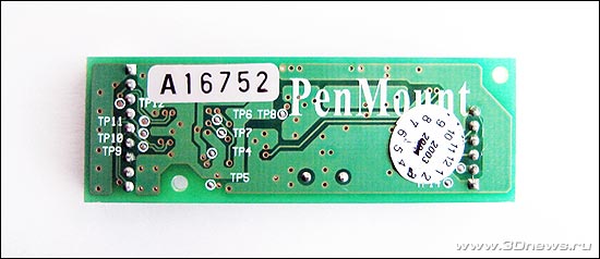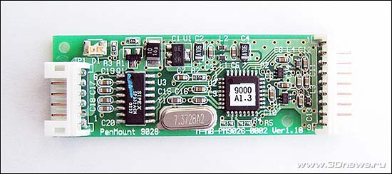 Резистивная технология основывается на методе замера электрического сопротивления части системы в момент прикосновения. Для определения координат X и Y используются специальные чувствительные слои, между которыми находится еще один, "нейтральный". Когда верхний слой соприкасается с нижним, электрическая цепь замыкается и контроллер получает информацию о координатах X и Y с верхнего и нижнего слоев соответственно. Для того, чтобы контроллер мог отличать сигналы, токи верхнего слоя текут в перпендикулярном направлении по отношение к нижнему. По сравнению с другими типами "точ-скринов", резистивный обладает высокой разрешающей способностью (300 точек/дюйм), большим ресурсом (10 млн. касаний), небольшим временем отклика (около 10 мс) и низкой стоимостью. Но помимо плюсов есть и минусы, например такие, как 20% потеря светового потока. ![]() Контроллер был взят того же производителя - PenMount 9026. Модель 9026 совместима с четырех и восьми проводными конструкциями. Контроллер предназначен для установки внутри корпуса монитора и имеет RS-232 интерфейс подключения. ![]() Технические характеристики PenMount 9026: