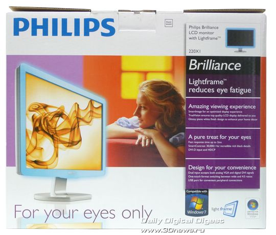 Розничная упаковка Philips 220X1 выполнена в светлых тонах, согласно дизайну монитора. Крупным планом изображён монитор со включенной подсветкой Lightframe, тут же крупным шрифтом нанесен тот самый слоган "Только для ваших глаз" на английском языке.