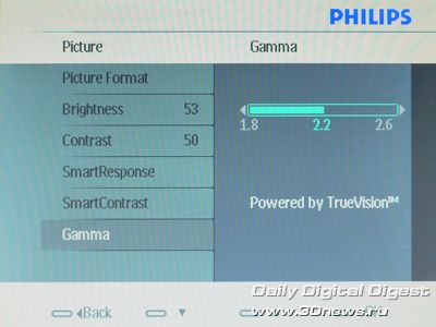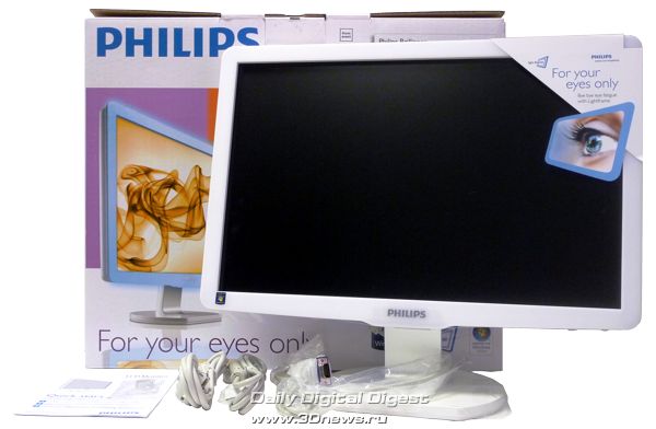Дисплей может похвастать белым глянцевым корпусом изысканного дизайна, временем отклика 5 мс (порядка 2 мс GtG), функцией SmartContrast для обеспечения динамической контрастности 30000:1, функцией SmartImage для оптимизации изображения, портом USB 2.0 для удобного подключения периферии. В наличии также действительно широкие возможности по тончайшей профессиональной настройке качества изображения TrueVision. Есть возможность переключения между широкоформатным и 4:3 изображениями одним нажатием кнопки. И, разумеется, традиционный "конёк" компании Philips – оптимизация энергопотребления.