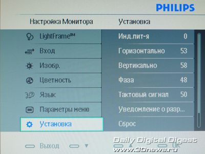 Настройки монитора разнообразны и, что приятно отметить, организованы весьма удобно. Именно благодаря тому, что кнопки панели управления имеют разную форму, после непродолжительной тренировки управлять настройками на ощупь не составляет никакого труда. Также хотелось бы отметить превосходную русификацию меню дисплея.
