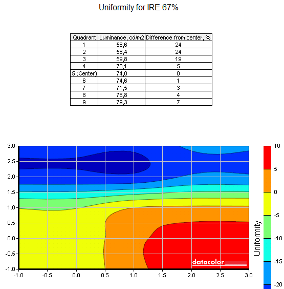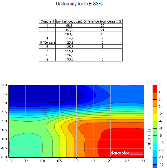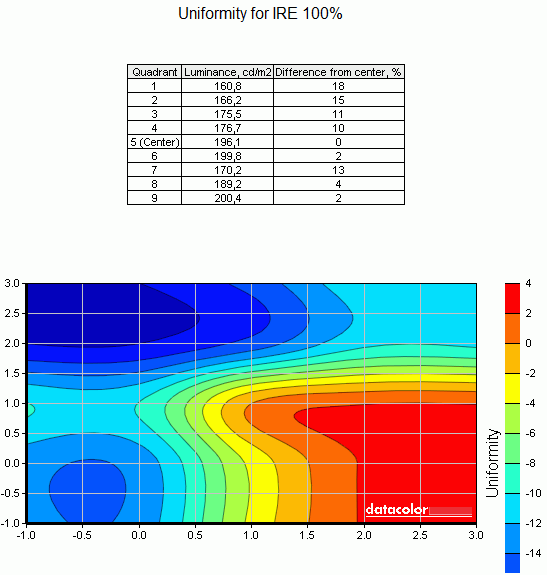 Оценку неравномерности засветки экрана мы проводили путём последовательного сравнительного замера уровня яркости в девяти контрольных зонах экрана при разных уровнях серой шкалы, выраженных в процентных единицах измерения композитного видеосигнала IRE (принято рекомендацией ITU-R BT.470 для определения сигнальных уровней в стандартах PAL, NTSC и SECAM). В результате измерений для монитора Philips 220X1SW были получены следующие результаты: