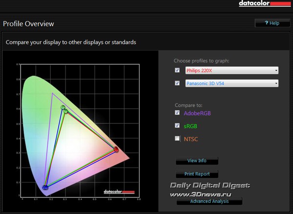 Оценка цветового охвата дисплея производилась с помощью колориметра Spyder3 из комплекта Spyder3Studio, с применением программного обеспечения, обновлённого до версии 4.0.2. На приведённом ниже скриншоте CIE-диаграммы треугольник красного цвета отражает цветовой охват дисплея монитора Philips 220X1SW; синий цвет соответствует охвату плазменной панели Panasonic 3D V54, зелёный цвет соответствует охвату стандартного цветового пространства sRGB, треугольник сиреневого цвета, соответственно, описывает охват стандартного цветового пространства AdobeRGB.