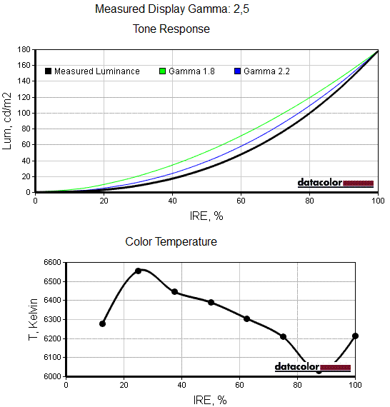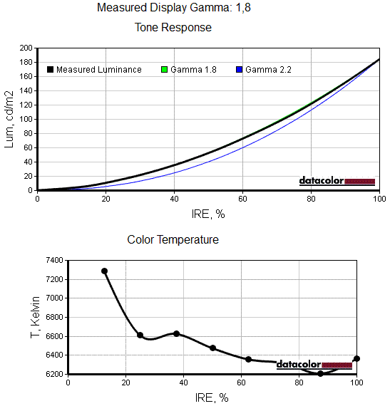 На приведённых ниже скриншотах показаны графики гамма-кривых и зависимости цветовой температуры, полученные в результате калибровки дисплея.
