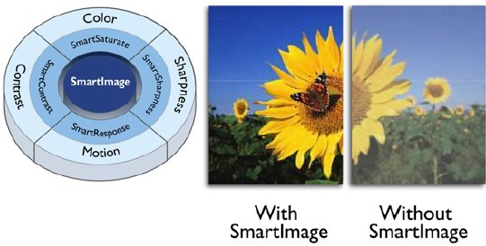 Следующая технология – SmartImage, имеет вполне конкретное прикладное значение и отвечает за динамическую оптимизацию контрастности, насыщенности и резкости изображения, в зависимости от результатов анализа картинки в реальном времени. Функция активируется нажатием одной кнопки.