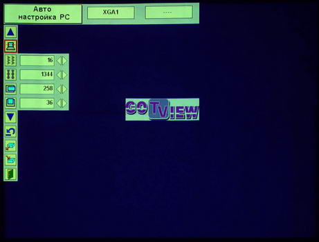 Третий пункт состоит из двух страниц - это сборник настроек. На первой странице собраны следующие настройки: автоматическая настройка параметров, синхронизация, настройка точек по горизонтали, настройка горизонтального и вертикального положения картинки.