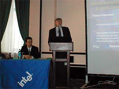Александр Палладин, президент пресс-службы Intel в СНГ и странах Балтии заявил, что начиная с понедельника будут проведены аналогичные презентации Pentium 4 3,06 ГГц в ряде городов региона: 18 ноября в Санкт-Питербурге и Киеве, 19 ноября – в Нижнем Новгороде, 22 ноября – Екатеренбурге, Ростове, а 27 ноября – в Новосибирске и Самаре. По окончании мероприятия Дагу Бушу были заданы некоторые вопросы, мы приведём наиболее интересные из них: