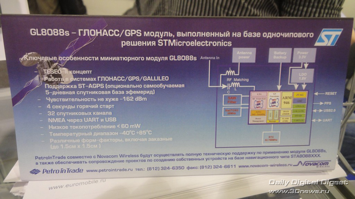 Фирма «ЕвроМобайл» тоже показала ГЛОНАСС-чип STA8088SAL, совместную разработку Novacom и CT. Обещали его продавать по цене односистемного модуля, правда, не уточнили, какого. Novacom, как известно, производит большую линейку навигационных устройств, поэтому она будет интегрировать этот приёмник в свои треккеры. Но и продавать как самостоятельное изделие тоже собирается. Параметры приёмника можно посмотреть на фотографии. Сроки же запуска в производство мне деликатно не назвали.