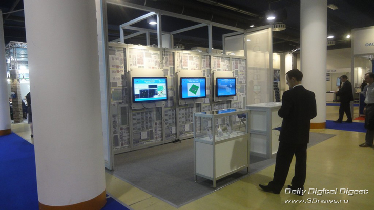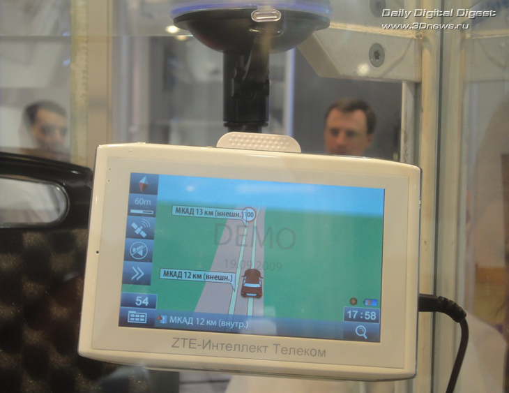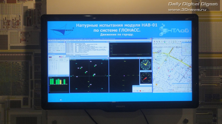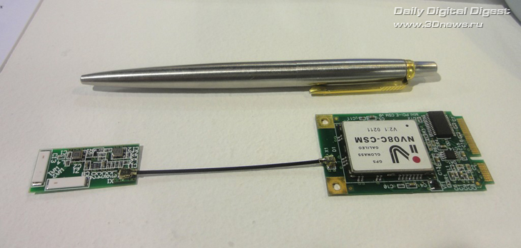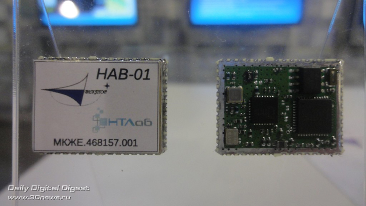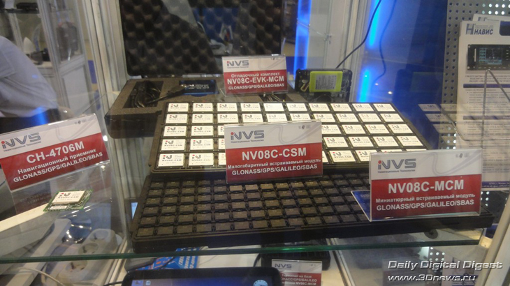 КБ НАВИС показало несколько собственных изделий на приёмнике NV08C. Одно из них — модуль на плате mini PCI-E с антенной ГЛОНАСС на отдельной микроплате с процессором Intel Atom, соединённой с модулем проводочком. Её можно вставить в любое устройство, в котором есть соответствующий разъём, и получить полноценную навигацию. Рассчитывают, что интерес к этой штуке проявят владельцы планшетников — именно на планшете и демонстрировалась работоспособность устройства.