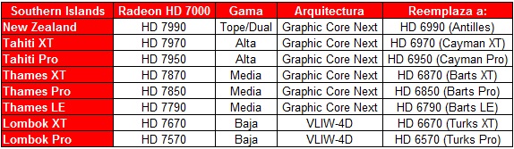 Линейка ускорителей, известная под кодовым именем Southern Islands, объединит по крайней мере восемь видеокарт. Топовое решение с кодовым именем New Zealand будет называться Radeon HD 7990, очевидно, оно и заменит на рынке Radeon HD 6990. Что интересно, лишь видеокарты Radeon HD 7670/7570 будут использовать старую архитектуру VLIW-4D, остальные решения построят с применением новой архитектуры. Скорее всего, 28-нм ускорители будут представлены в последнем квартале нынешнего года, возможно, их анонс состоится одновременно с представлением 32-нм процессоров AMD FX на базе микроархитектуры Bulldozer.