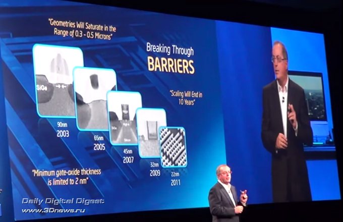 Сюда же автоматически попадают все громкие заявления руководства Intel, сделанные им во время ежедневных плановых ключевых докладов. И, конечно же, почти все элементы шоу-программы таких докладов, как, например, кремниевая пластина с памятью или процессорами, выполненными по новейшему техпроцессу, или выуженный из кармана докладчика и показанный всего на несколько секунд прототип процессора будущего года.