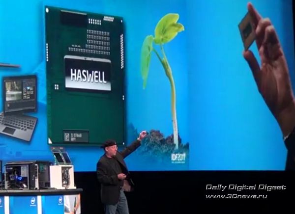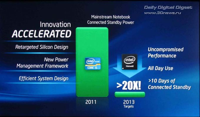 Также прямым намёком на особенности архитектуры Haswell можно считать слова Пола Отеллини, отметившего в своём докладе, что ультрабуки будущего будут способны запускаться от солнечного элемента размером с почтовую марку. Сегодня такие разработки пока что подаются в качестве исследовательского проекта с почти пороговым напряжением питания транзисторов (проект "Intel Near Threshold Voltage Core"), однако ближе к 2013 году, как знать, возможно, именно эта технология позволит добиться вышеупомянутой 10-суточной работоспособности ультрабука в ждущем режиме.