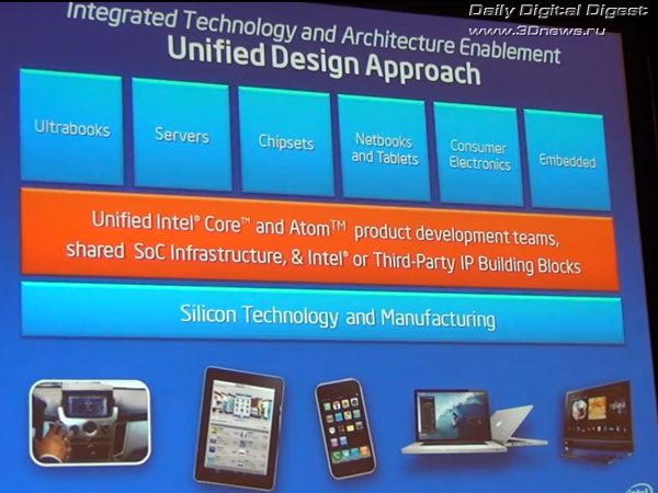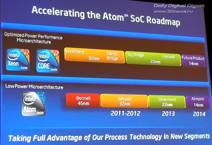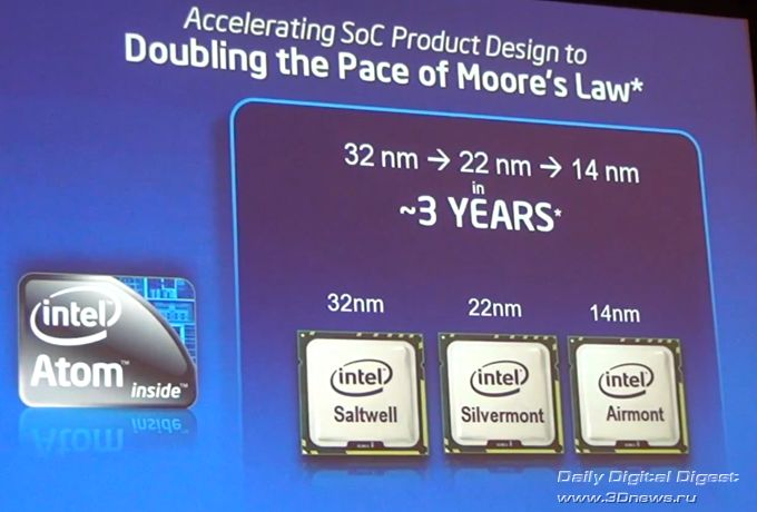 Более того, в связи с объединением команды разработчиков чипов для настольных и серверных систем с командой разработчиков "систем на чипе" платформа Atom будет эволюционировать гораздо быстрее ранее намеченных сроков. Так, переход к 32-нм чипам Saltwell и далее к 22-нм SoC Silvermont и 14-нм системам Airmont произойдёт за рекордные три года.