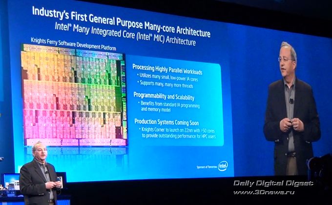 Прежде всего, Джастин Раттнер объявил о грядущем запуске в массовое производство наследников архитектуры Larrabee, первых мультиядерных чипов семейства Knight Ferry с числом ядер более 50 под рабочим названием Knights Corner. Очень важно при этом отметить, что с самого начала чипы будут выпускаться на производственных линиях с соблюдением норм 22-нм техпроцесса, это сразу же позволит обеспечить разумный расход энергии для питания столь сложных чипов.
