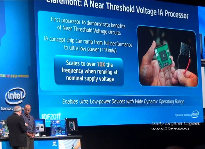 И вновь, в который раз за эти три дня была продемонстрирована уже упомянутая выше (правда, в другом ракурсе) экспериментальная разработка Intel Labs, процессор Claremont с "околопороговым напряжением питания" (Intel Near Threshold Voltage Core). По словам Джастина Раттнера, применение схемотехники с рекордно низким напряжением питания, близким к напряжению включения транзисторов, существенно сокращает энергопотребление и позволяет добиться, когда необходимо, высокого быстродействия и снизить потребляемую мощность до уровня ниже 10 мВт при небольшой нагрузке.