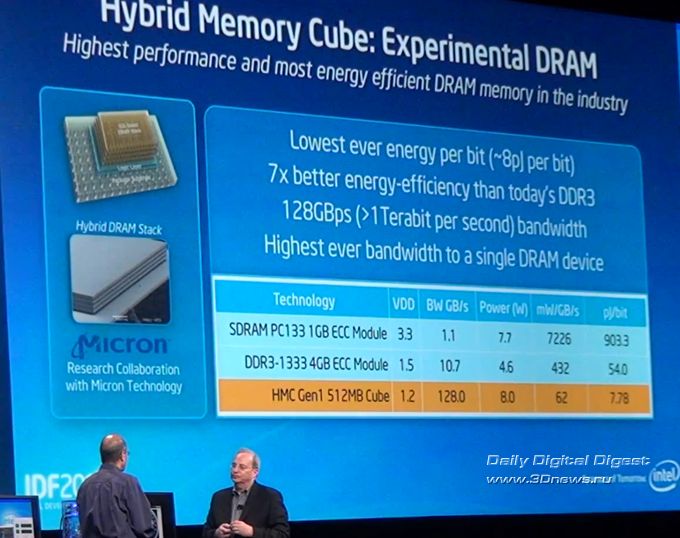 В дополнение к этому сотрудники Intel Labs рассказали о совместной с компанией Micron разработке нового типа памяти — Hybrid Memory Cube, обладающей семикратно лучшей энергоэффективностью, нежели современная память DDR3. В Hybrid Memory Cube используется чип стековой памяти, формирующий компактный "куб", а также высокоэффективный интерфейс памяти с низким энергопотреблением на бит переданной информации, обеспечивающий скорость передачи данных в один триллион бит в секунду.