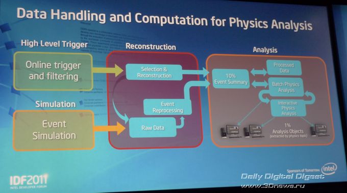 В качестве примера эффективного использования многоядерных продуктов Intel с новой архитектурой Many Integrated Core (MIC) был описан опыт применения кластеров многоядерных процессоров Intel в Европейском центре ядерных исследований (CERN), что значительно повысило производительность приложений, используемых в физике высоких энергий.
